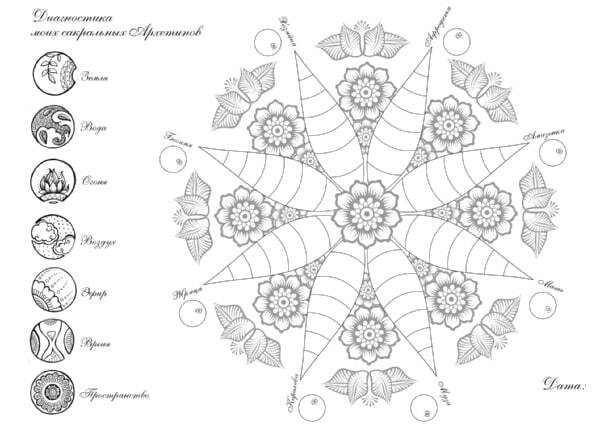 Распечатайте рисунок с цветком и от основания к концу лепестка закрашиваем теми цветами, которые приходят в мыслях. Интенсивность окрашивания зависит от развитости гран архетипа по стихиям, если не проявлена грань по стихиям оставляем неокрашенными. Для подсказки картинка с архетипами и стихиями. Посмотрите какой является Женщина нового времени, в эпоху матриархата. Посмотрите сколько граней и всем этим женщина зная, умеет наполняться,